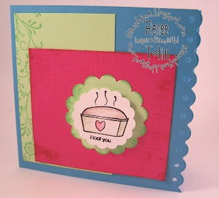 When I got the hostess set, "Comfort Food", I couldn't wait to use it! This little stamp is so cute! I used the Stampin' Pastels and a blender pen to color in the image. I used 1 1/2" and 2" scallop circle punches. I inked the edges of everything and used the Always in Bloom wheel on the inside and the outside of the card.